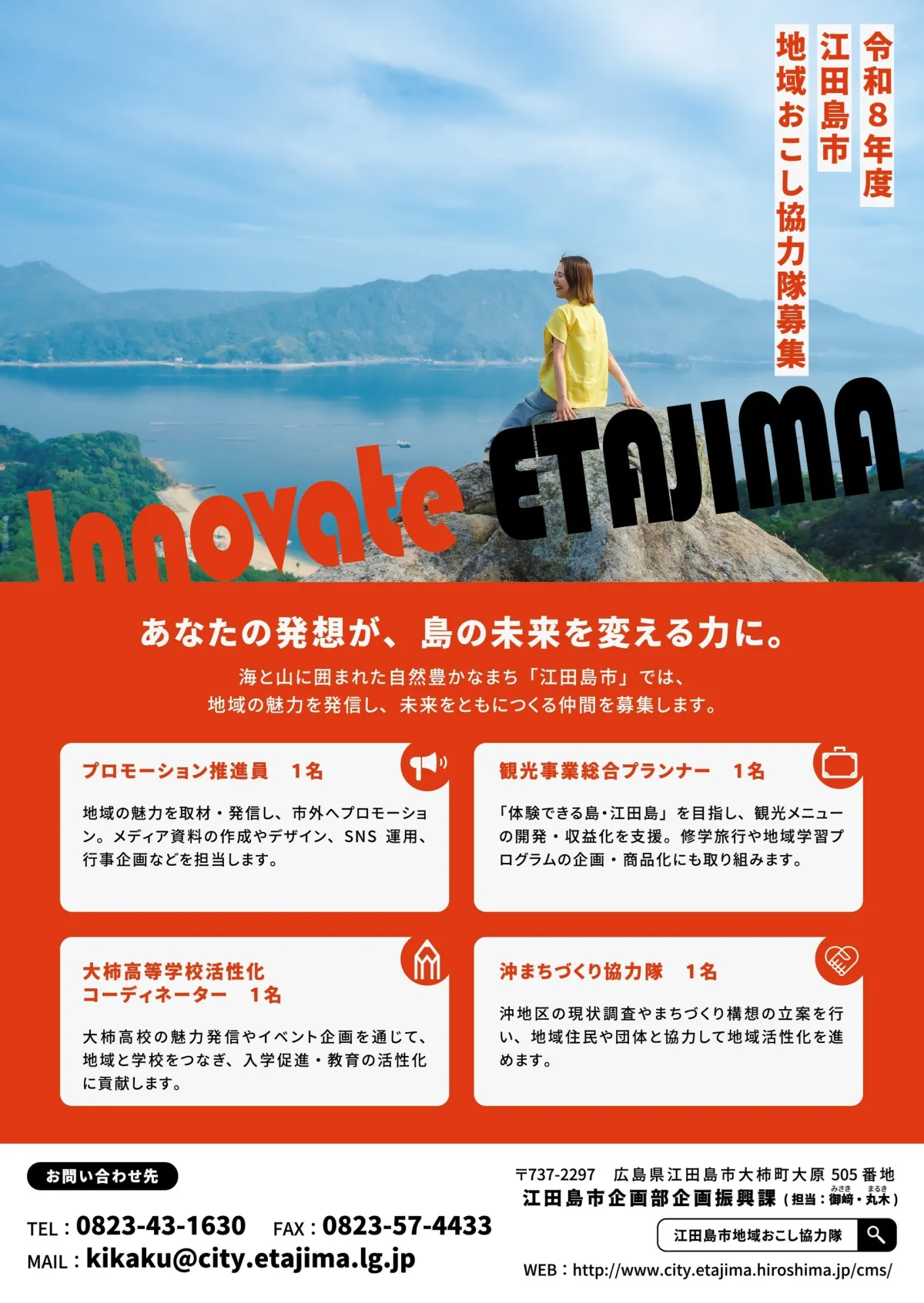 応募や詳細については、江田島市企画部企画振興課にお問い合わせください。電話またはEメールでの連絡が可能です。地域の一員として、新たな挑戦をしませんか?江田島市での生活は、きっと豊かな経験になることでしょう!