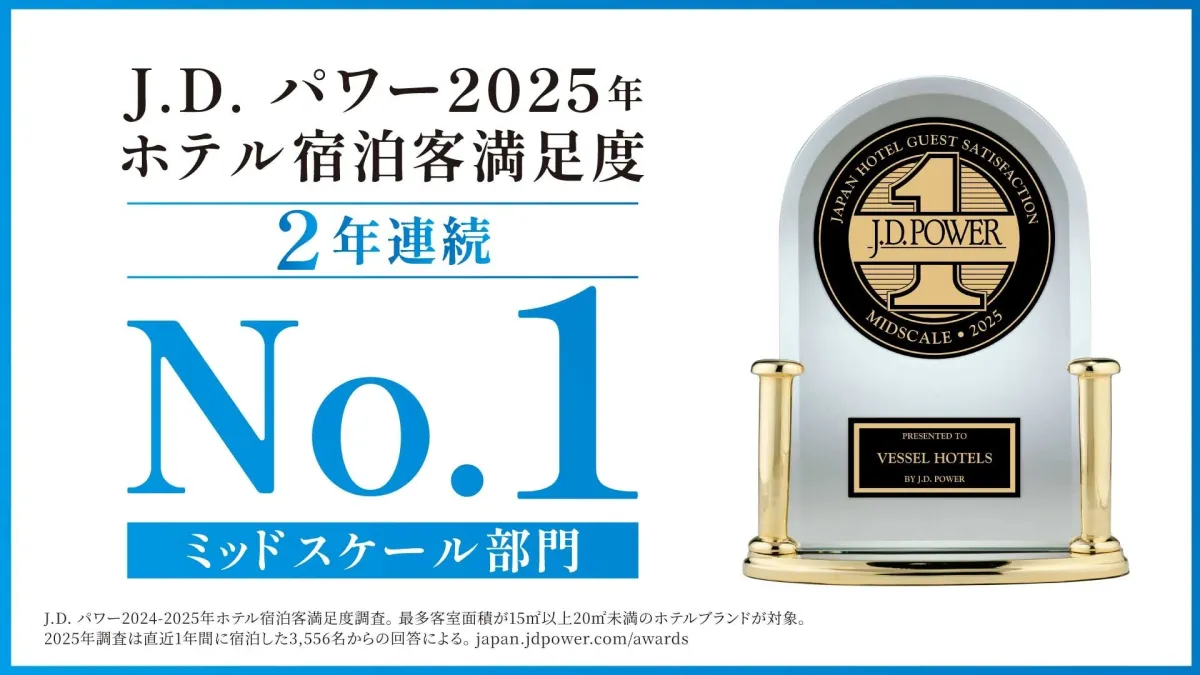 広島県福山市に本社を置く株式会社ベッセルホテル開発が運営する「ベッセルホテルズ」が、2025年のJ.D. パワーの宿泊客満足度調査でミッドスケールホテル部門の第1位を2年連続で獲得しました。これは、ベッセルホテルズが手掛ける4つのホテルブランド(ベッセルホテルカンパーナ、ベッセルホテル、ベッセルイン、REF by VESSEL HOTELS)が、幅広いサービスと充実した顧客体験を提供し、多くの宿泊者に高く評価された結果です。