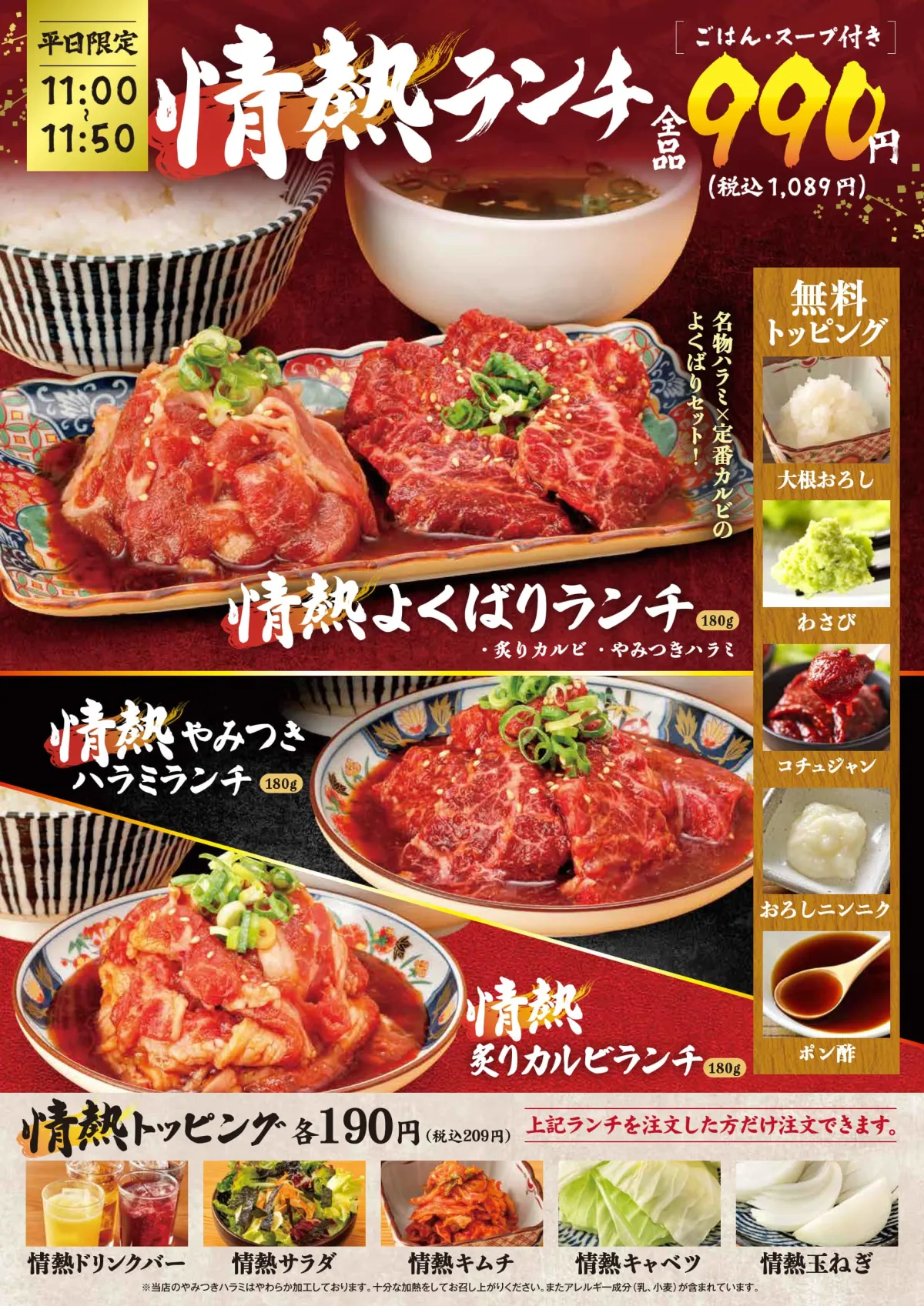 二つ目は、選べる3種類のランチメニューです。お肉は「情熱よくばりランチ」、「情熱やみつきハラミランチ」、「情熱炙りカルビランチ」の3つ。各メニューには、ごはんとスープがついています。特に「情熱よくばりランチ」は、定番の「やみつきハラミ」と「炙りカルビ」が楽しめるハーフ&ハーフセットで、非常に人気があります。