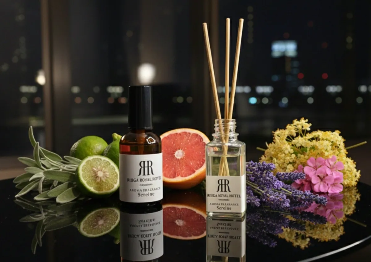「Sereine」という名称は、フランス語で「穏やかな」「静かな」を意味し、まさに夜空に舞い降りる静かな香りの雫をイメージしています。この香りは、リーガロイヤルホテル広島オリジナルで、那覇市の「株式会社Gotas」が手がけたもので、セージやベルガモット、グレープフルーツなどをバランス良くブレンドした天然香料100%で構成しています。