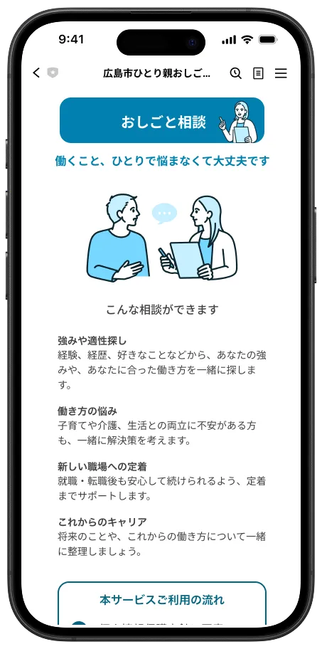 このサービスは、仕事、家事、育児を一手に担うひとり親家庭の保護者が、気軽に相談できるオンラインプラットフォームを提供し、就業支援を通じて経済的な自立を促進するものです。具体的には、LINEを用いて就業相談から職業紹介、就職後の定着支援まで、一貫してサポートが提供されます。