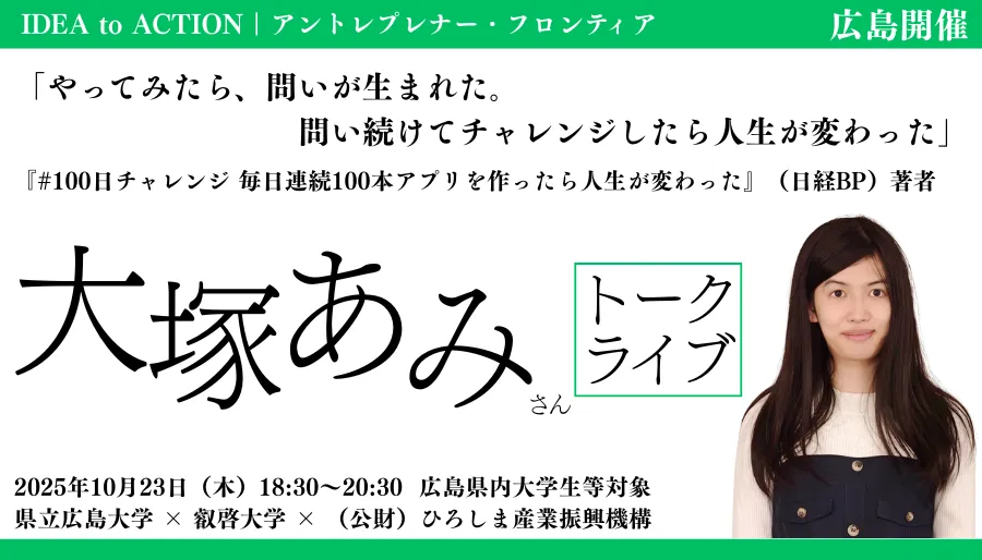 広島市中区に位置する叡啓大学が、2025年10月23日(木)に特別セミナーを開催します。これまでの経験をもとに、自らの挑戦を語るトークライブには、著名な著者であり起業家の大塚あみさんが登壇。彼女の講演は「やってみたら、問いが生まれた。問い続けてチャレンジしたら人生が変わった」というテーマで、私たちに多くの示唆を与えてくれることでしょう。