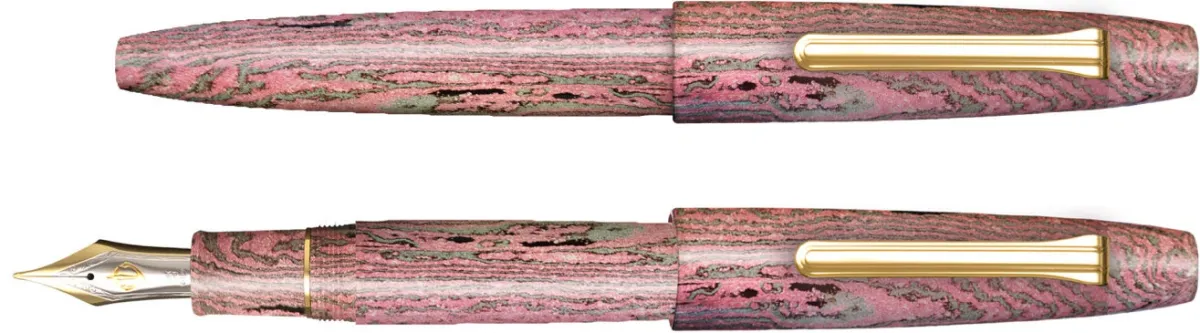 万年筆のボディには、最適とされるエボナイト素材が使用されています。一本一本手作業で削り出され、丁寧に磨き上げられることで得られる光沢感や手に馴染む感触は、所有する喜びを与えてくれます。「梅咲」の色合いは、チラシエボナイト技術で表現され、色を重ね合わせて美しさを引き立たせています。