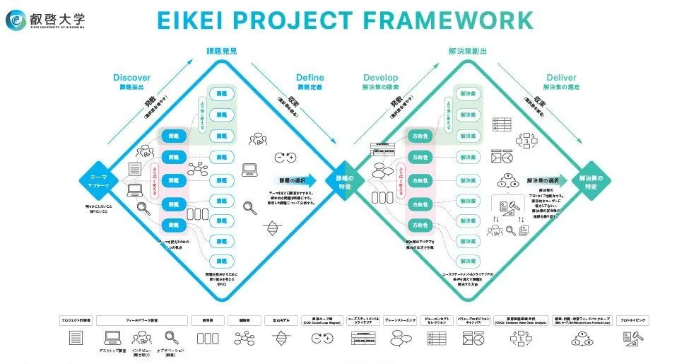 叡啓大学では、学生が社会のさまざまな問題に向き合うための独自のフレームワークを開発し、課題解決演習(PBL)に役立てています。このフレームワークは、プロジェクトの初期段階において「なぜそれに取り組むのか」「誰のために、何を、どのように実現したいのか」といった視点を整理するための思考・対話の枠組みです。