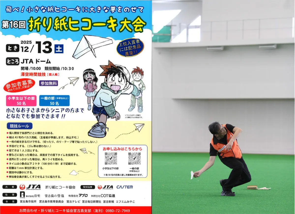 2025年12月13日、沖縄県の美しい宮古島で「第16回折り紙ヒコーキ大会」が開催されます。会場はJTAドーム宮古島で、開催時間は開場10時、競技開始は10時30分です。この大会は「小学生以下の部」と「一般の部」という2つのカテゴリーに分かれ、各部門には50人ずつの参加者を募集しています。参加者は無料で、大会の内容を楽しむことができます。