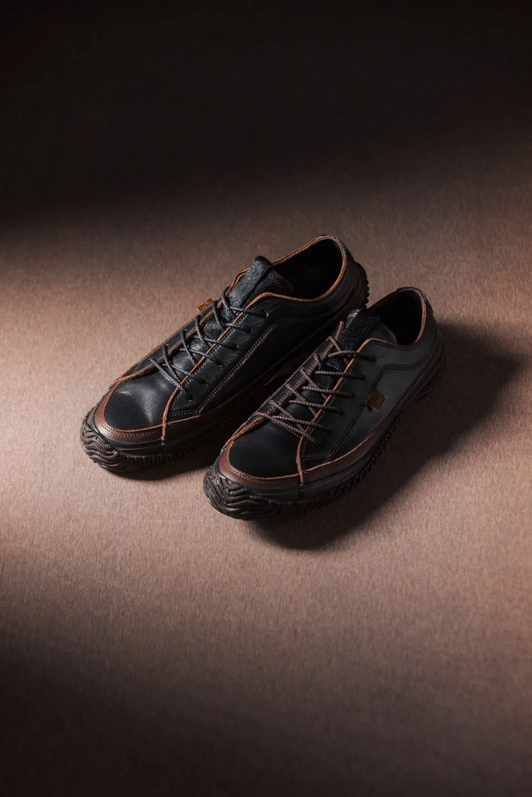 このスニーカーは、古代より人々に親しまれる「馬」の強さや前進をイメージし、その意義を形にしたものです。アッパーには深みのある艶やかなホースレザーが使用され、この馬の重厚感を見事に表現しています。さらに、シュータンや踵の部分には、馬の鬣をモチーフにした毛付きの牛革が配置されており、視覚的にも力強さが感じられます。