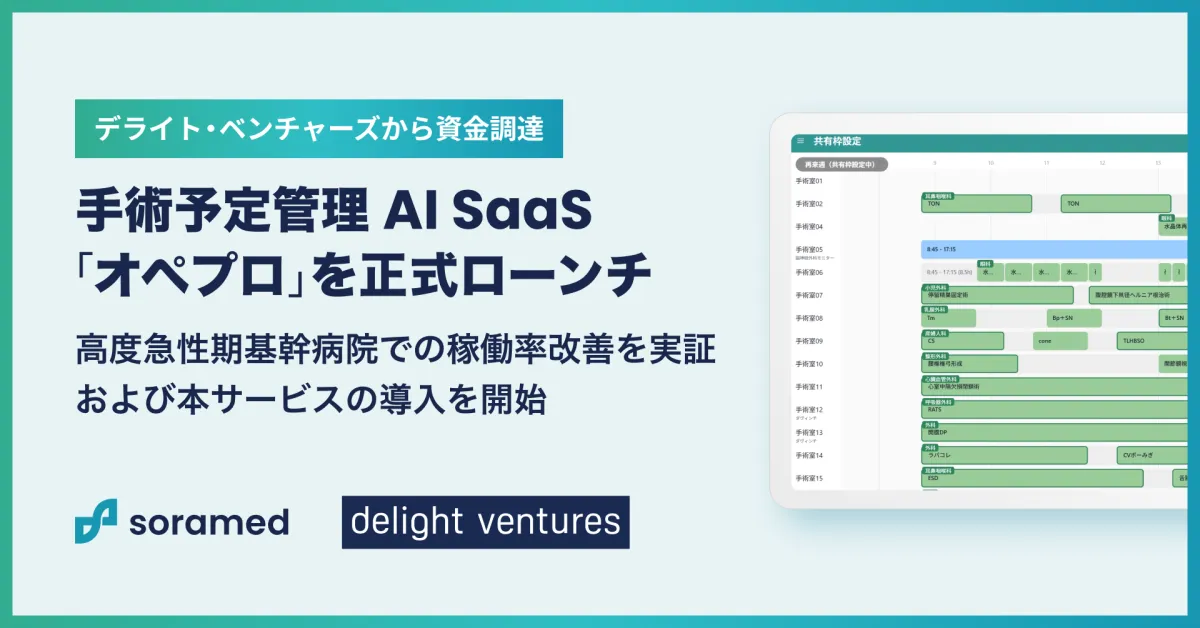サービスの発表にあたり、ソラメドはデライト・ベンチャーズからの資金調達も行いました。この資金はプロダクトの開発加速やカスタマーサクセス、マーケティングに充てられ、より一層のサービス強化を図ります。